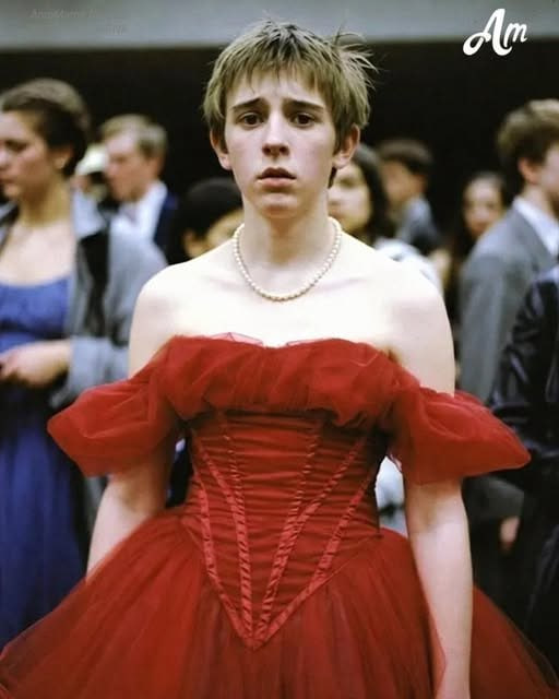 Liam entered through the double doors wearing a flowing red dress that shimmered under the auditorium lights.