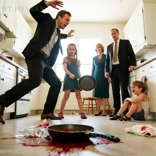 The skillet connected with the right side of Blake’s skull just above his ear. His head snapped sideways. His eyes rolled back. He dropped. Just collapsed, went down hard, and didn’t move. Norah immediately released the skillet. It clattered to the floor. She ran to Finn, knelt beside him, her small hands gentle as she checked him over. Then she stood and ran out of frame.