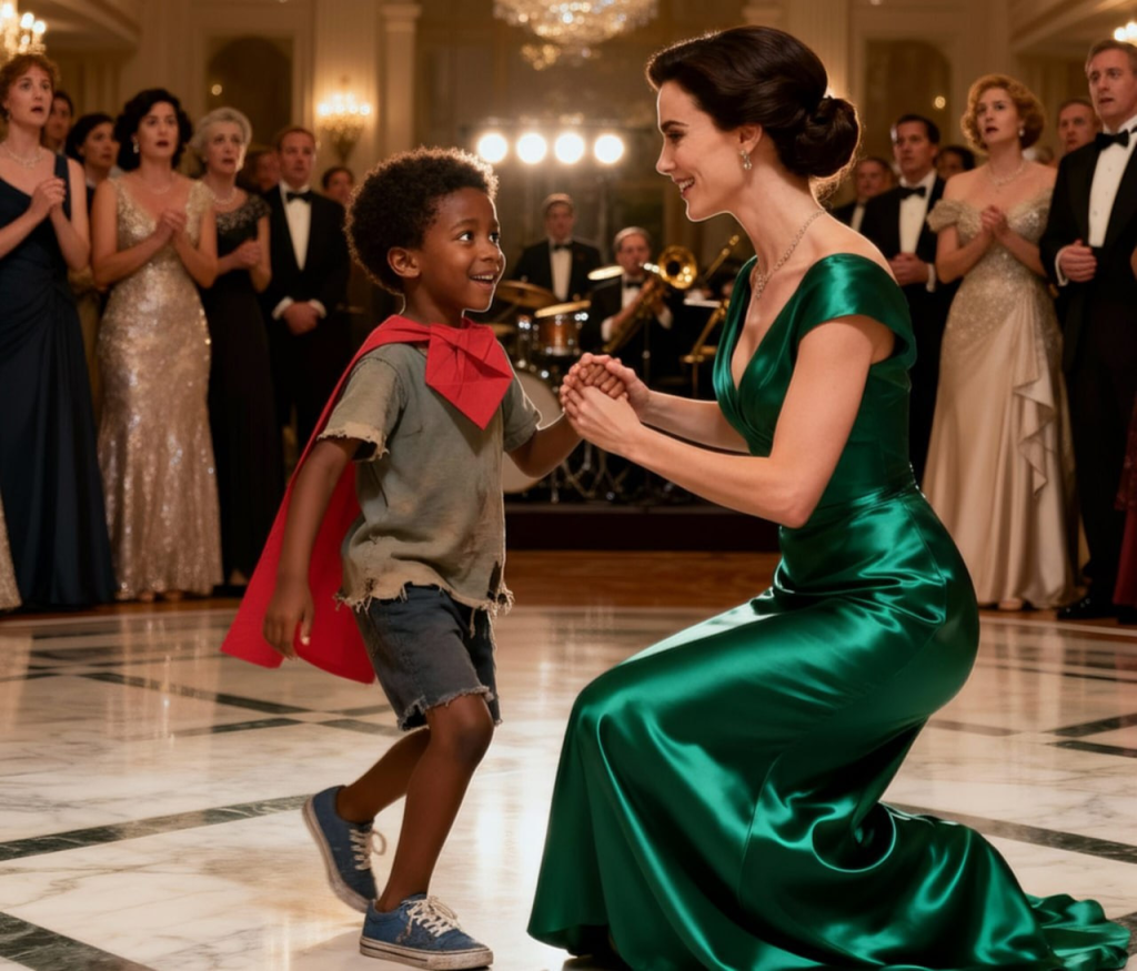 The room fell silent. Dozens of powerful guests — CEOs, politicians, actors — turned to watch. The billionaire in her silver gown and the little orphan boy with his paper cup of juice stood at the edge of the dance floor.