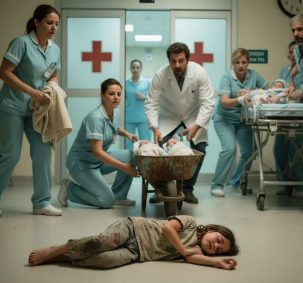 For a moment, the room fell silent. Then, in an instant, the place erupted into motion—doctors rushing forward, nurses lifting the babies, a stretcher appearing out of nowhere. The girl’s legs gave out, and she fainted right there on the tile floor.