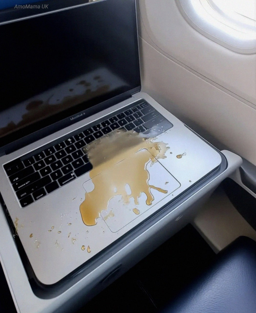 I thought nothing more of it until I heard the sound of liquid splashing. In a split second, I felt something cold and wet all over my lap and laptop.
