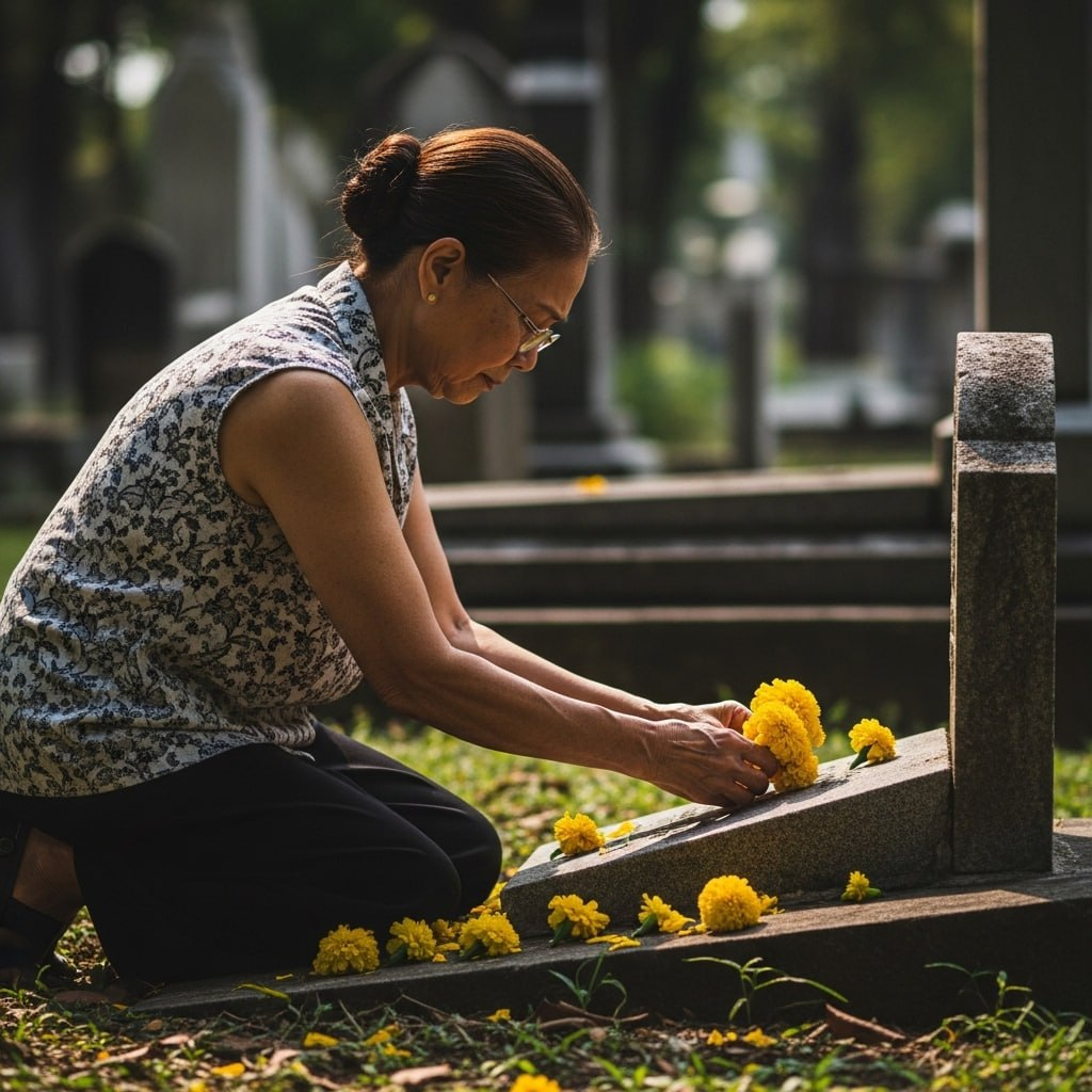 She got out of the taxi, her gaze fixed on the gate, and turned to the driver. “Please wait here… I won’t be long.” With a deep, painful sigh, Brenda entered the cemetery, flowers in hand.