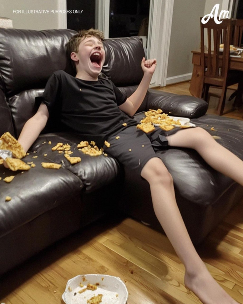 The next morning, the living room was a mess. Empty pizza boxes, soda cans, and crumbs were everywhere.
